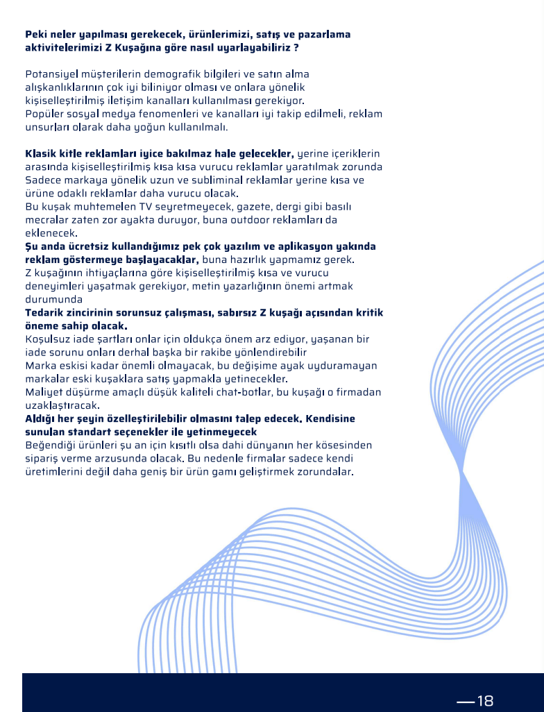 Z kuşağına ait bu değerlendirmeler bizler için önemli. Çünkü onlar on beş yıl içerisinde tüketici pazarını BB+X kuşağı ve Y Kuşağı ile eşit oranlarda paylaşıyor olacaklar.